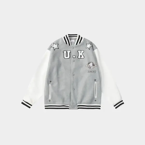 Burberry Leather Sleeve Technical Wool Varsity Jacket Grey/White