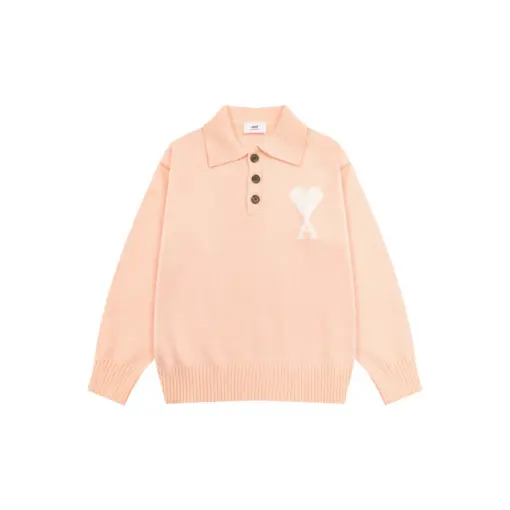 Ami Paris White Heart Jacquard Alpaca Blend Loose Polo Neck Pullover Sweater Light Gray
