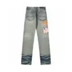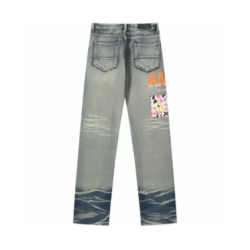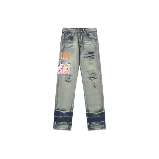 Amiri Straight Leg Logo Appliquéd Embroidered Distressed Jeans Light Blue With Orange Monogram