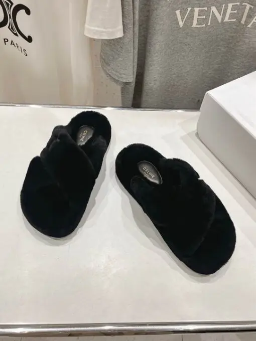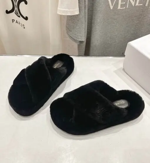 Be the first to review “Celine Cross Fluffy Fur Slippers Black”