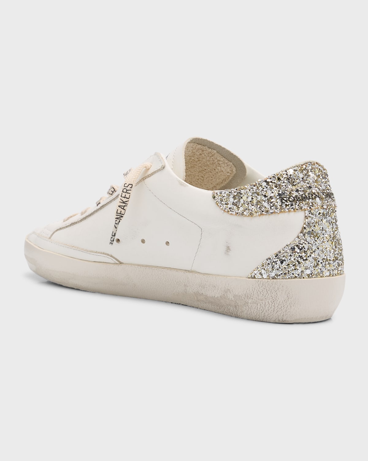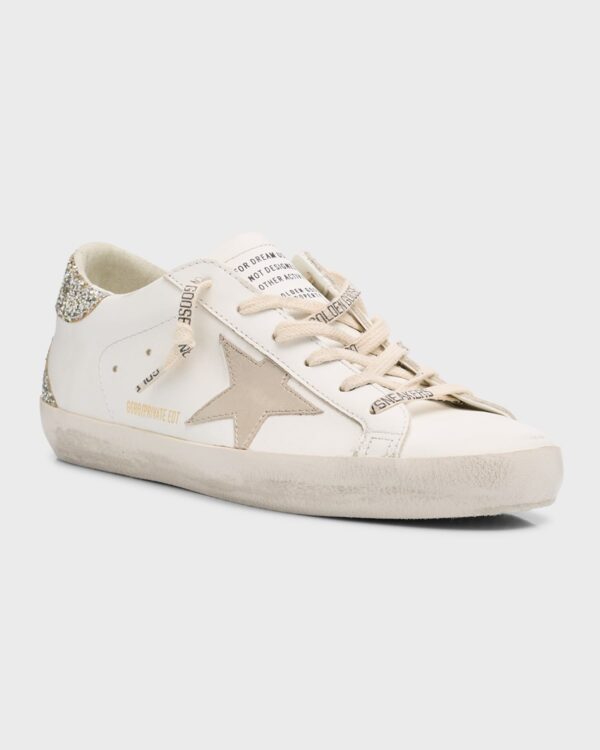 Step into the world of Italian luxury with the iconic golden goose superstar sneaker, the ultimate statement piece for luxury casual footwear. Handcrafted in Venice, this shoe embodies authentic, lived-in style with its signature pre-distressed finish, eliminating the awkward break-in period. The pristine premium white leather upper is beautifully contrasted by a dazzling designer glitter heel tab and the iconic metallic leather star appliqué, providing a subtle yet powerful sparkle.