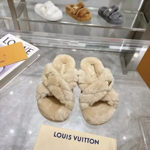LV Bliss Comfort Mule Shearling Crossover Straps Embroidered With Heritage Malletage Pattern Light Brown