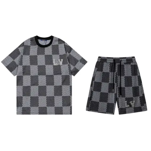 LV Damier Short-Sleeved Cotton Crewneck And Crystal LV Patch Set Black
