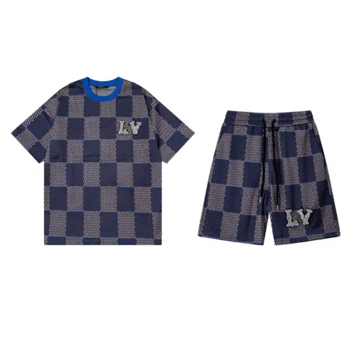 LV Damier Short-Sleeved Cotton Crewneck And Crystal LV Patch Set Blue