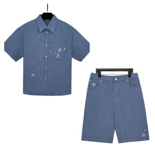 LV Embroidered Chambray Short-Sleeved Shirt And Shorts Set