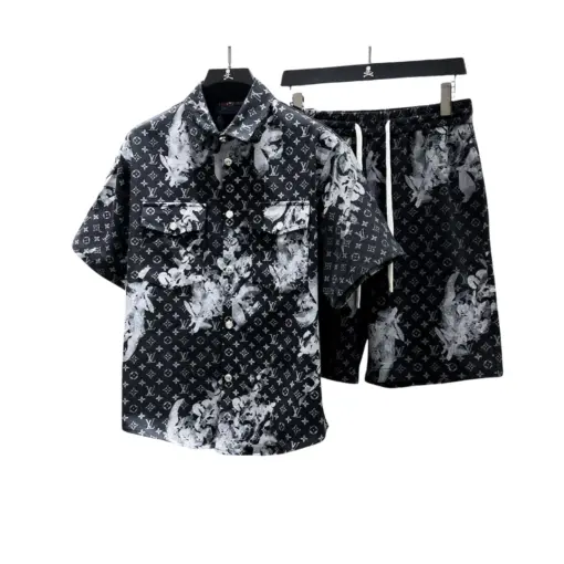 LV Monogram Bandana Short-Sleeved Denim Shirt And Shorts Set Black