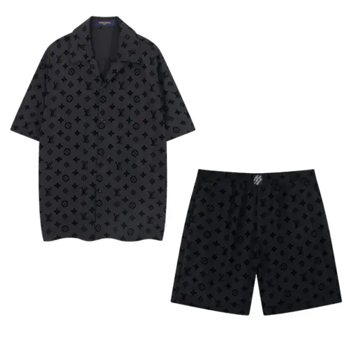 LV Monogram Printed Black Short-Sleeved Silk Shirt And Shorts Set