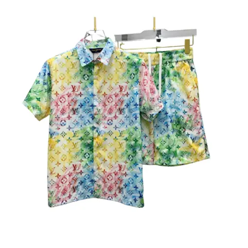 LV Multicolored Monogram Print Short-Sleeve Shirt And Shorts Set