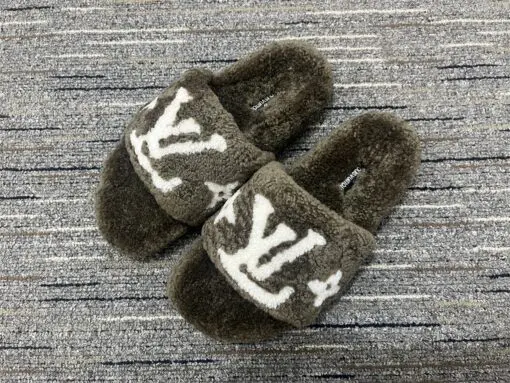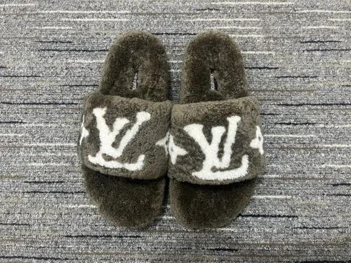 LV Bliss Brand Plaque Shearling Mules Plush Straps Gold Tone