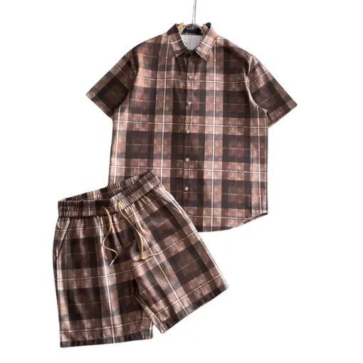 LV Plaid Button-Up Shirt And Matching Shorts Brown