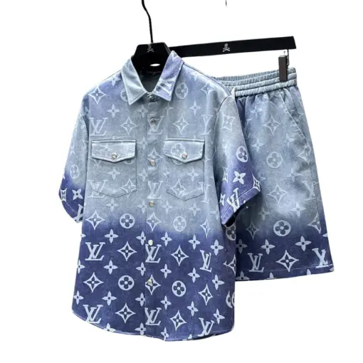 LV Printed Monogram Japanese Denim Shirt And Shorts Set