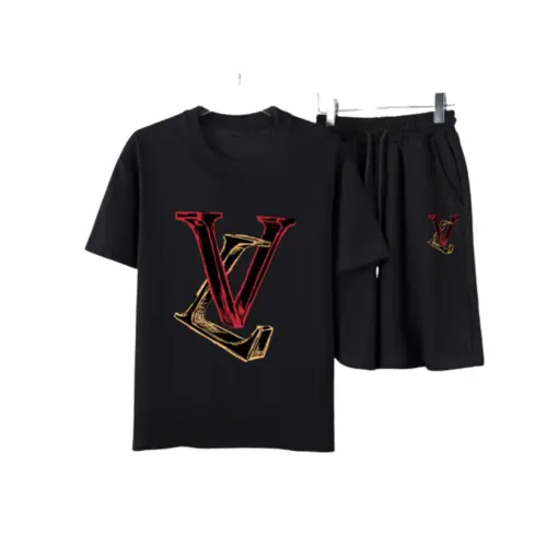 LV Red And Black 3D Graphic Letter Print T-Shirt And Shorts Set Black