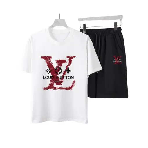 LV Red Distressed Logo T-Shirt And Shorts Set White