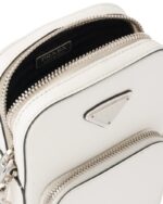 Defined by a versatile and contemporary design, this mini bag is made of Saffiano, an iconic material of Prada: calf leather of the highest quality, defined by a crosshatch pattern and waxed finish. The enameled metal triangle logo adorns the accessory.